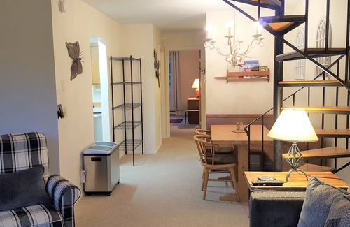 This Mountainside Condo is a quiet, top-floor unit with vaulted ceilings located in the quaint "historic village" of Sugarbush Resort; a 2-minute walk to ski trails and a 5-minute walk to the base lodge. The convenient ski locker is at the building entrance. Within mere steps are restaurants (Mutha Stuffers, Chez Henri French restaurant, A La Carte, and The Reks bar), Mountainside Ski Shop, day care/school, and heated summer pool (as seen from balcony). The main level has a relaxing balcony with spectacular views spanning the mountain and the Mad River Valley. See the Valley House Quad, Super Bravo, Heaven’s Gate, and Village Quad lifts spinning and watch skiers on Stein's Run, Murphy's Glades, Spring Fling, and Lower Snowball. Vaulted living room has gas fireplace, comfy furnishings, updated decor which is changed to reflect season and is perfect for viewing the torchlight parade and fireworks during holiday weeks. Dining area has a custom-crafted banquette, the bathrooms are renovated and plush spa towels are provided. Bedrooms boast luxurious king mattresses (read the reviews about these!), luxurious winter bedding which is changed to crisp non-ski-season bedding. Kitchen is original but updated and more fully equipped than most, with newer appliances, including 5-burner range, microwave, quiet dishwasher, toaster oven, toaster, blender, crock-pot, cookware & bakeware. First level has a full bath with shower/tub combo and a king bedroom. 2nd floor has another king bedroom with vaulted ceilings, en suite full bath with shower/tub combo, 3 large upper clerestory windows for sleeping under the moonlight, and a reading nook. Ski to the Village Quad lift via the "Out Road" trail or get to the base lodge via a 5 minute walk over the covered bridge or take the shuttle. Ski back on the "Out-to-Lunch" or "Easy Rider" and "In Road" trails that lead skiers to just below this unit's balcony.