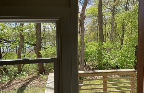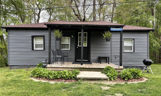 The Skinny Dipper cottage is newly renovated in 2017. It is not on the lakefront, but about 150 yards from the beach area. It is nestled up next to the woods, with a double bed in one bedroom, and two twin beds in two other bedrooms. It also has a covered porch, and its own campfire ring. No pets.