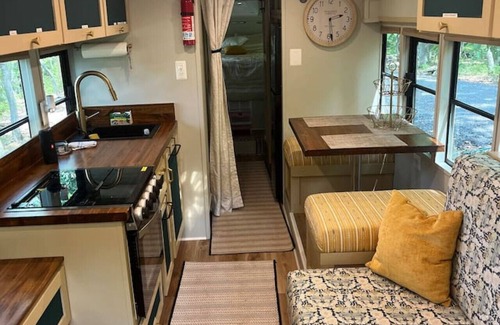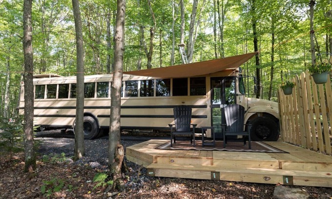 "Stay in a renovated 2015 school bus at a cozy glamping resort in Garrett County just minutes from downtown Oakland & Swallow Falls. This chic bus has a mini kitchen, shower, bathroom, Roku TV, sleeping space, and patio grill. Relax on the attached patio with views of the farm, where deer often roam. Enjoy an evening hike on the marked trails through the woods, leading you to friendly cows. It’s the perfect mix of comfort, nature, and adventure for a memorable weekend getaway."