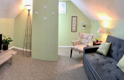 This second floor apartment overlooks rooftops in the popular Germantown/Schnitzelburg area. Walk to restaurants, breweries and diners. All amenities are just blocks away. The living space has a SERTA convertible sofa(queen bed) or can be positioned as a recliner. Large spa like shower.Kitchenette has a refrigerator, microwave, toaster, air fryer, and coffee maker.Access to laundry facilities.