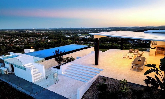 Float over the Gold Coast in a 20-acre estate home with ocean and skyline views, and huge windows to drink them in. This mountain villa wows inside and out with marble and limestone accents, wood-burning fireplace, basketball & tennis courts, and spectacular infinity pool. A recent $1million+ architectural renovation of the entire house has created a modern and stunning residence. The panoramic views are unparalleled anywhere on the Gold Coast, with views of Brisbane City to the entire Gold Coast glitter strip - including the Pacific Ocean. Totally exclusive and private with a gated fence.