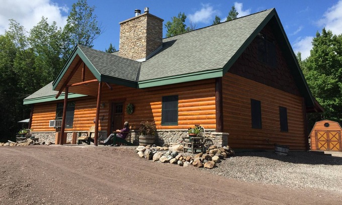 Follow the winding drive to our secluded house set in the middle of 20 wooded acres. Relax on the decks, walk the trails on the property or use this as a base for trips to Duluth or up the North Shore. There are two bedrooms on the main floor, each with a queen bed and plenty of dresser space. The first bedroom has a good size closet with built in dresser and place to hang clothes. The second bedroom has a separate exterior door leading to a newly built stamped concrete covered porch. Opposite the bedrooms and heading up the log staircase, you'll find a sitting area with a futon offering an additional full bed (if requested) and access to a second story deck, great for star gazing. There's an open floor plan large kitchen, dining and living area, offering seating for 6. The kitchen has a coffee maker, microwave, toaster oven, dishwasher, fridge w/ice maker, stove/oven and is stocked with all the essential non-food items. Internet is provided, as well as a small collection of DVDs and a TV in the main living area with another upstairs in the futon room. The claw foot tub/shower in the single bathroom is great for soaking/reading. Towels, bedding and throws (for chilly weather) are included. There is an additional shower stall in the utility room, along with the washer and dryer available to guests. Outdoors there's plenty of seating, a fire-pit and a charcoal grill. Wood, charcoal and grilling accessories are provided. There's a covered porch along the north side of the house and a small covered storage area to sit should it rain. Feel free to roam the property, though we'd recommend not trying to enter the small cabin or outhouse since it's likely some of the wildlife have moved in! We continue to expand the walking trails and hope to have a couple of miles meandering through the wooded property.