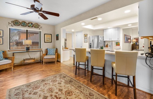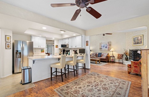 Nestled at the base of Flagstaff's iconic Mount Elden, this charming 3BR/2BA mountain retreat is ideal for families or groups seeking a peaceful escape. Bask in starlit nights from the private hot tub, surrounded by towering pines and mountain views by day. Comfortably sleeping six, this home also welcomes your furry friend, offering a spacious, fully fenced yard perfect for canine adventures. Enjoy an affordable stay with all the comforts of a cozy mountain getaway.
