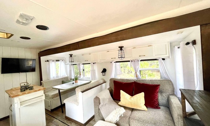 Escape to our lovingly refurbished 26’ camper—a peaceful forest hideaway just 10 minutes from downtown Nevada City and the sparkling Yuba River. Relax in the hammock, enjoy your morning tea surrounded by nature, stargaze under clear skies, or beat the heat by visiting river spots like Jones Bar and Hoyt’s Crossing less than fifteen minutes drive. We provide a Cozy queen bed, full bath, minimal kitchen, clean and white refurbished camper with a shabby chic charm—plus live music and a vibrant theatre scene just ten minutes away in our lovely historic towns of Nevada City and or Grass Valley.