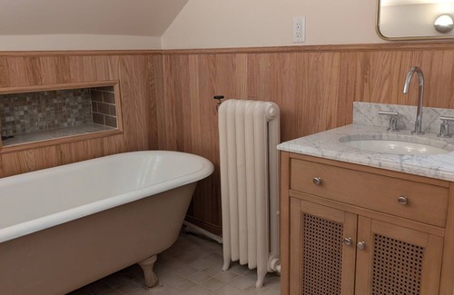 Enjoy views from the balcony, a fully stocked kitchen with gas stove, peaceful environment from the healing offices below, and a newly renovated shower and cast iron clawfoot bathtub.