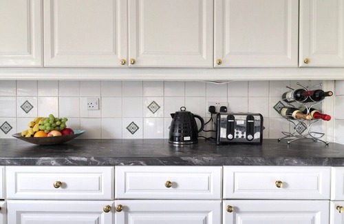 This fully furnished house boasts essential amenities designed for a stress-free stay. Enjoy the convenience of a well-equipped kitchen with modern appliances, including a dishwasher, coffee maker, and cookware for preparing delicious meals. The living area features cozy seating and entertainment options such as high-speed internet and Netflix for evening relaxation. Step outside to unwind in the private back garden or take advantage of the free parking available on the driveway. Please note that while the ambiance is perfect for a wedding retreat, parties or loud music are not permitted to maintain the peaceful setting.