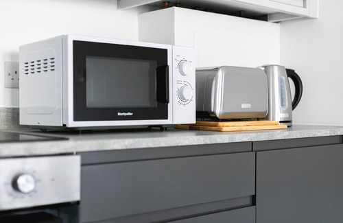 The fully equipped kitchen, which includes a fridge freezer, washing machine, microwave, toaster, induction cooker, hob, oven, kettle, and coffee/tea facilities, encourages you to partake in sophisticated dining experiences.