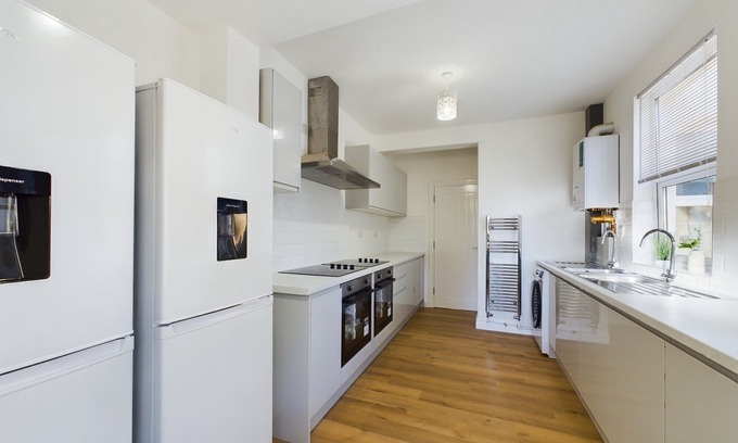 This spacious three-storey townhouse in the vibrant Redfield area of Bristol is perfect for groups and families looking for a comfortable and convenient holiday let. Boasting six double bedrooms, each with ample storage, the property comfortably accommodates larger groups. The modern kitchen is a standout feature, fully equipped with two ovens, two cookers, a fridge freezer, and a washer/dryer combo—ideal for those who enjoy cooking and need the convenience of self-catering.