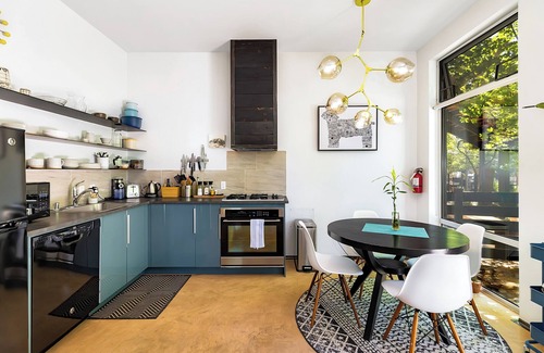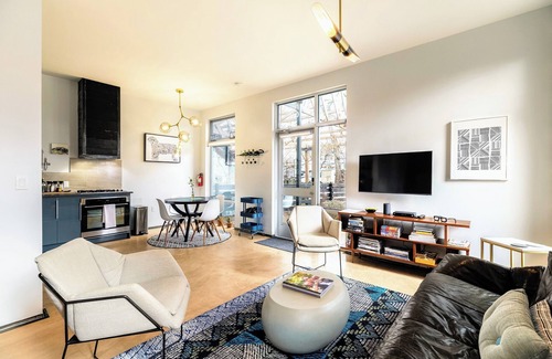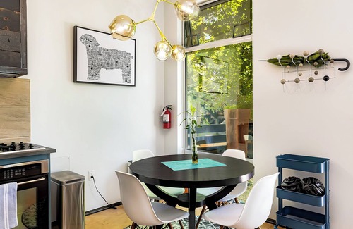 Luxury designer ground-floor apartment in Santa Fe's Railyard District. Chic modern design, fully equipped cook's kitchen with dining for 4, dishwasher, and washer/dryer. Private yard, steps from Cafecito (coffee shop), near Meow Wolf, Railyard Park, and the Plaza. Easy downtown access via scenic trail. High-speed internet. King bed with lux sheets. Whole Foods & Trader Joe's nearby. Bikes available. Part of a creative community in a repurposed industrial building. Additional units available.