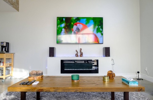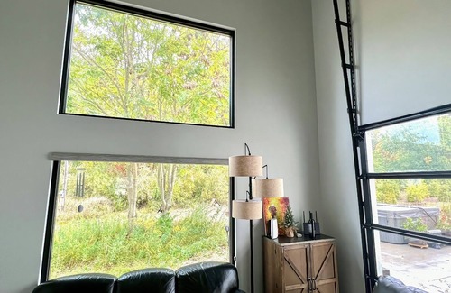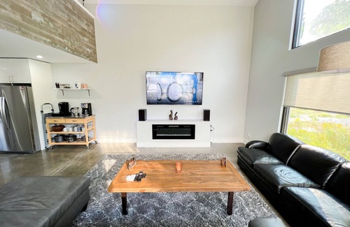 - Sleek forest retreat: karaoke, spa, campfire, pool table, grill, outdoor games