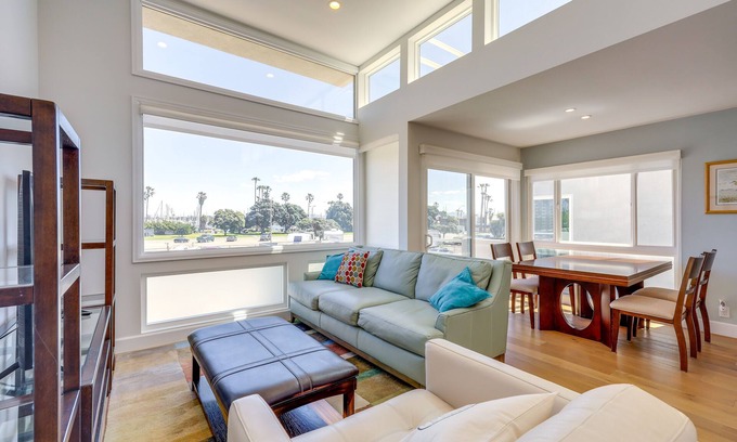 Experience the height of coastal living at this exquisite vacation rental in Oxnard, CA. Gaze at the nearby marina from the balcony, then prepare your favorite meal in the modern kitchen or on the gas grill! This bright 2-bedroom, 2-bathroom townhome also boasts several picture windows, vaulted ceilings, and a desk for remote work. Going out? Walk to Hollywood Beach and cast a line at Channel Islands Sportfishing. Your Golden State getaway awaits!