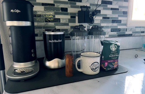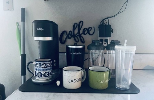 The fully stocked kitchen includes modern amenities such as a coffee maker (iced and hot), air fryer, and complimentary local coffee and tea. Our property boasts smart technology with a Nest thermostat and smart entry/exit using the last four digits of your phone number.