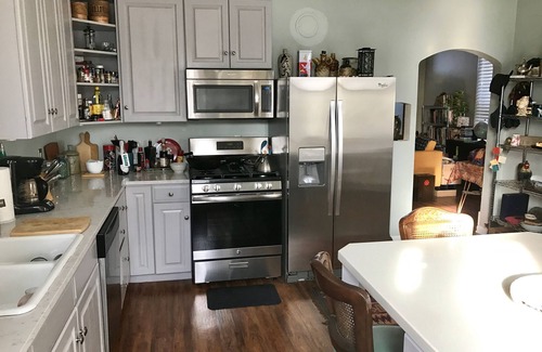 Artfully appointed two bedroom 1 1/2 bath home with full kitchen, living room. Main level includes the kitchen, living room and extra half bath. The second level includes two large bedrooms with king size beds and a fully updated bathroom with walk-in shower. The home is located in the heart of Louisville's trendy Germantown neighborhood. It is centrally located between the Highlands, Churchill Downs, and downtown, and just around the corner are Goss Avenue restaurants, bars, and a Kroger store. This remodeled two-story home has hardwood floors, The full kitchen is complete with a gas stove, microwave, coffee maker (with coffee and tea). The backyard has a table and chair as well as a fire pit and grill in a relaxing garden.