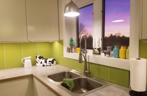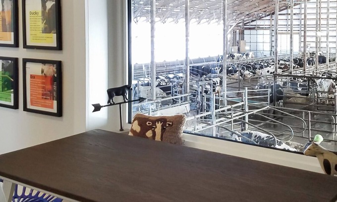 The cows are ready to meet you at New Day Dairy’s GuestBarn in North Iowa! Cow gaze 24/7 while “sleeping with cows” in modern comfort! The loft features 2 large windows overlooking 150 cows munching their “cow salad”, lounging on the “beach”, or heading to be milked by “Rita the Robot”! You'll be fascinated by following one of the "painted" cow's life in the barn. Get up close to the cows & calves on guided intro & farewell barn tours! Welcome to New Adventures, Authentic Cows, and Comfy Beds!