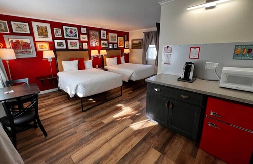 Our Two Double Beds room features two double beds, a flat-screen TV with cable, a retro mini-fridge with freezer, a microwave, a small table with 2 chairs, a Keurig coffee maker with regular coffee, decaf coffee, and tea.