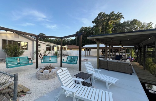 Old Florida waterfront. All new boat houses and dock area including 3 covered boat slips 25-30ft. Beautiful renovated house to accommodate 13 quests. Plenty of parking for trucks and trailers. Theater room. All rooms and dock have smart TV with fast WiFi. Firepit with swings and lightning throughout backyard. Enjoy the best place and waterway in central Florida.
