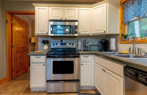 You will find our cabin warm and inviting. The bank of windows in the living room give beautiful views and make you feel right at home in the big woods. In addition, the open concept kitchen-living-dining area keeps everyone together but with enough room to spread out. The living room opens onto the large wrap around deck with a patio table. The indoor dining room table seats 6+ and there are 4 more seats at the kitchen bar and a second table that seats 4. The living room TV is ready for streaming with Starlink internet. The Big Woods kitchen is loaded with cookware and everything you need to prepare and serve a full meal or to just whip up something quick. We have enough dinnerware for everyone. Our household is split on coffee- so we offer both from the pot and a Keurig. Off of the kitchen is a 1/2 bath.
