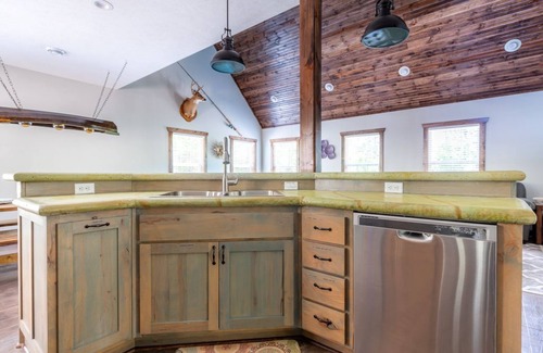 You will find our cabin warm and inviting. The pine wood ceilings, unique fixtures and beautiful views make you feel right at home in the big woods. In addition, the open concept kitchen-living-dining area keeps everyone together but with enough room to spread out. The living room has two seating areas. The dining room table seats 12+ and there are 5 more seats at the kitchen bar. The TV is ready with a DVD player, current and classic movies and Starlink internet for streaming. The Big Woods kitchen is loaded with cookware and everything you need to prepare and serve a full meal or to just whip up something quick. We have enough dinner ware for everyone and ample storage in the pantry. Our household is split on coffee- so we offer both from the pot and a Keurig.