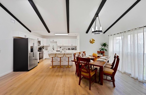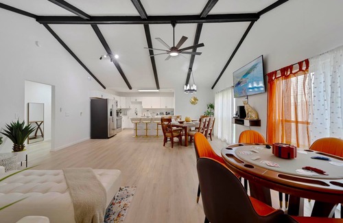 Sleeps 17 people!! Your own Stunning luxury home with its own backyard beach! Resort Style Heated Pool! Poker table, Pickleball, Pool table, Mini Golf, Chess, Dominoes games, Aw did we mention Cornehole and surfboard Bar! Enjoy the Outdoor Gazebo with a Waterfall! OMG! Enjoy West Tampa, the immaculate kitchen, 4 spacious bedrooms, 1 game room, 2 full baths and an outdoor shower, solar heated! Minutes away from downtown, Zoo Tampa, USF, Bush Gardens, Adventure Island, Hyde Park, Raymond James Stadium, Airport, International Mall, Shopping centers, Malls, you will love the conveniency of this location, and all the games, see you soon!