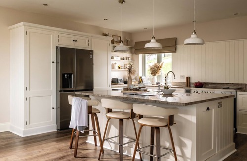The open plan, farmhouse style chef's kitchen is the perfect space for entertaining. It is fully equipped with a Bertazzoni Professional Series 120cm induction top + griddle, electric double oven Range Cooker, 2 x Bosch silent dishwashers, an integrated NEF microwave, an American Fridge Freezer which dispenses both ice and filtered water, Tassimo coffee machine (capsules supplied), as well as instant coffee, teabags and sugar.