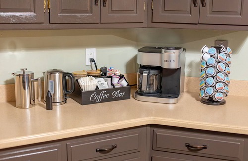 - Keurig, drip-coffee, and French press machines. Coffee, sugar, tea, and creamer provided