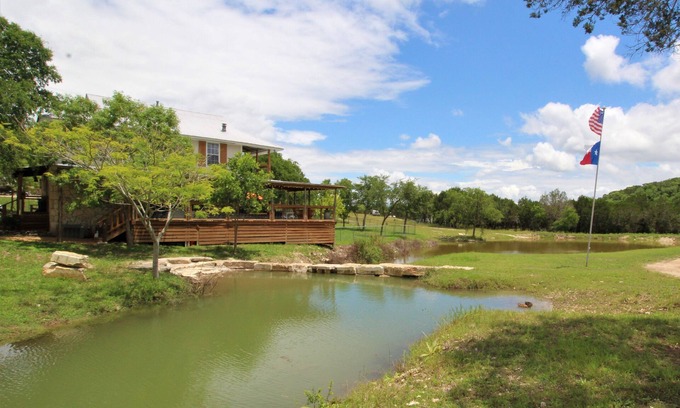 Paradise Canyon is an inviting home for couples, families, and groups who want a relaxing stay set within an authentic Texas Hill Country experience. The peaceful surroundings will allow guests to immediately unwind and feel that their getaway starts right when they check in. Morning coffee or an evening cocktail can be enjoyed on the gorgeous porch that offers a view of the water and the Hill Country scenery. Apart from the comfortable sleeping accommodations, there are all the amenities that make the experience one of a kind; Spring Fed Pond for swimming, kayaking, or paddle boating, outdoor fire pit, outdoor television on patio, indoor fireplace, full kitchen for dining and comfortable lounge area. Guests are perfectly located in the heart of the Guadalupe River! The property is only minutes from the historic, downtown Hunt, TX.