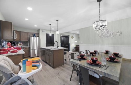 Downstairs on each unit you will find a laundry room with full-size washer, dryer, 2 bedrooms w/ queen beds & a good size bathroom with double vanity, tub/shower. Upstairs on each property you will find 4 very spacious bedrooms including our 2 incredibly themed "Enchanted Forest" kids room & "Final Frontier" kids room In this room you will see 2 beautiful bunk beds. Each kids Bedroom has 2 Arcades w/ 26 arcade games including Ms. Pac-Man, Galaga, StreetFighter II & many more. Bedroom has 4k Roku TV, board games, toys & much more to keep kids entertained.
