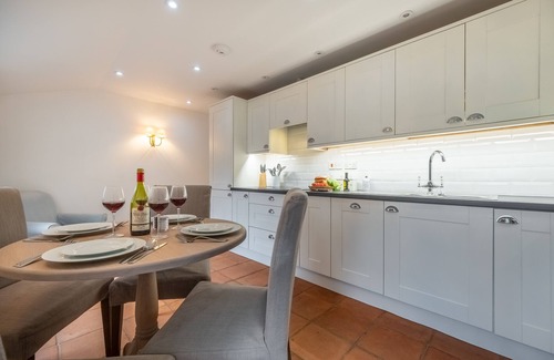 Kitchen – four chairs with matching table looking over the courtyard and adjacent to modern and large fridge/freezer, dishwasher, microwave, electric oven & hob, sink, toaster, Nespresso coffee machine and kettle.