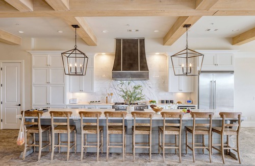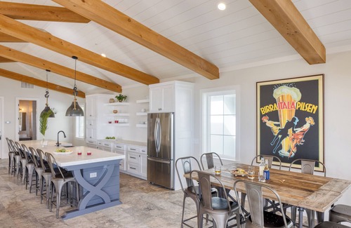 Upon entry, both homes have a bright, open-concept layout that creates a seamless flow throughout the main living area. Kick back and relax in front of the 74" mounted TV. Luxury design touches like exposed ceiling beams, tile floors, and high-end furnishings give you a one-of-a-kind experience. Chefs will adore the gourmet kitchens with stainless steel appliances, Elise 5-burner gas stoves, wine fridges, and ice makers. Dine at the islands' barstool seating, or at the nearby formal dining areas, both with seating for 12-14.