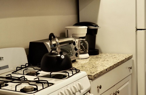 * Fully equipped kitchen with stove, microwave, toaster, and cookware
