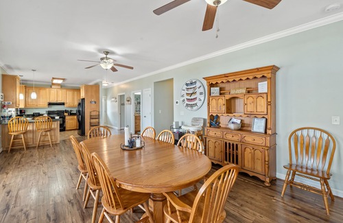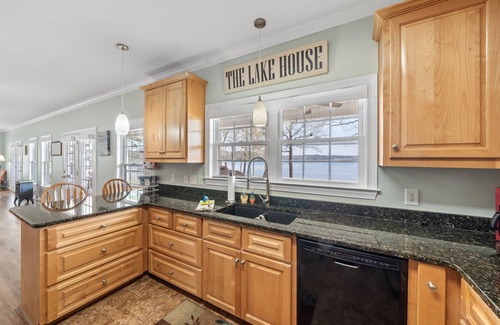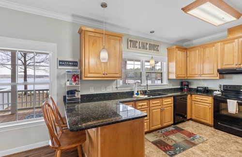 The home is a one-story. it is super clean, spacious and has amazing water views. You will love the large lake front porch which has 3 ceiling fans outside, 2 sitting areas and a sitting area for the kids. There is also baby gates on the porch so you can relax as your little ones are playing. You will also find a propane grill for cookouts (there is a $50 charge to use the propane). This home is also handicap accessible.