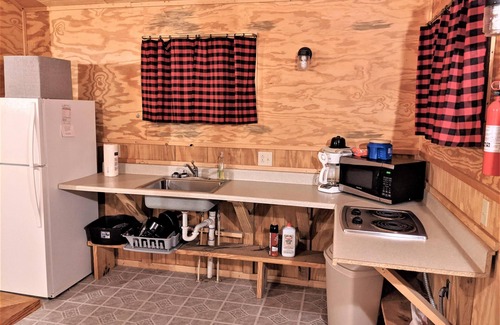 2 twin beds in the main room, 2 twin beds in the separate bedroom (twins can be converted to a king).We always stock our cabins with all bed linens, bathroom towels, soap, and toilet paper. The kitchenette has a two-burner electric stovetop built in, microwave, coffee maker, and a full-size refrigerator/freezer.We supply 2 small pots and 1 smallpan, paper plates, paper bowls, plasticware dishes, plastic cups, coffee and styrofoam coffee cups.There is a television but no satellite or cable TV. Feel free to bring your own DVD player, games, etc. and cords as we do not supply cords for devices. Free basic wifi - however not good for streaming.Outside, there is a covered porch with benches, your own picnic table and fire ring. You can cook on the fire ring and later push aside the grate to sit around the fire. Firewood is for sale on the porch. Guests have access to the parking lot and the yards behind the cabins. Feel free to bring a Frisbee!