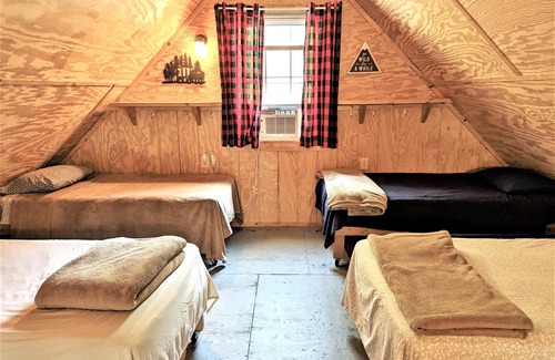 2 twin beds on the first floor, 6 twin beds on the second floor.We always stock our cabins with all bed linens, bathroom towels, soap, and toilet paper. The kitchenette has a two-burner electric stovetop built in, microwave, coffee maker, and a full-size refrigerator/freezer. We supply 2 small pots and 1 smallpan, paper plates, paper bowls, plasticware dishes, plastic cups, coffee and styrofoam coffee cups.There is a television but no satellite or cable TV. Feel free to bring your own DVD player, games, etc. and cords as we do not supply cords for devices. Free basic wifi - however not good for streaming. Outside, there is a covered porch with benches, your own picnic table and fire ring. You can cook on the fire ring and later push aside the grate to sit around the fire. Firewood is for sale on the porch. Guests have access to the parking lot and the yards behind the cabins. Feel free to bring a Frisbee!