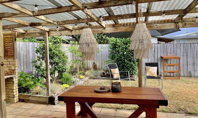 So close to the beach that you can hear the waves at night - just a short 200-metre walk. Cosy, comfortable bach with some modern touches. It has everything you need for a great holiday, just relax and put your feet up!