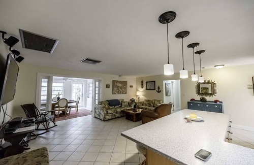This ground-level home is perfect for a wonderful Keys getaway in an area with some of the best boating in the Keys. Through the front door, there is a large kitchen, a dining area, and a living room with a large TV and a queen sleeper sofa. Off the living area is a hallway with two bedrooms. The master has a King bed and an en suite bathroom. The second bedroom has a Queen bed. A large outdoor area overlooks the beautiful canal where you can enjoy evenings after a fun-filled day on the boat grilling your catch. There is also a "bonus" room with a sleeper sofa that has its own entrance. Amenities include two TVs,, a barbecue grill, a washer/dryer, central A/C, and ceiling fans in each room. From the dock, there is excellent access to the Atlantic Ocean and Looe Key or the back-country and Gulf for fishing, diving, and kayaking. Just a short drive away you will find groceries, fuel, banks, restaurants, a marina, and more. Key West is a thirty-minute drive away and offers a unique history, exceptional dining, and great shopping. The Miami Airport is about a 3-hour drive. This is a non-smoking home. Ask about our pet policies. THIS HOME IS A 28-DAY MINIMUM RENTAL PER MONROE COUNTY CODE.