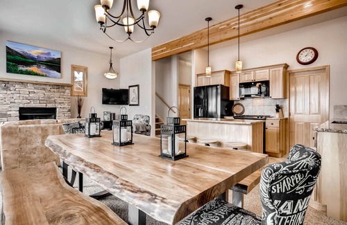 As you explore the amenities of Slopeside Paradise, you'll discover features that elevate your stay. The property boasts vaulted ceilings, a cozy fireplace, and radiant heat to keep everyone warm and comfortable. Entertain your guests in the fully appointed kitchen or gather around the gorgeous solid wood dining table that comfortably seats all. With ample sleeping options, including a master suite with a luxurious en-suite bathroom, a lofted area for relaxation, and bunk beds for younger guests, this retreat can accommodate wedding parties of various sizes.