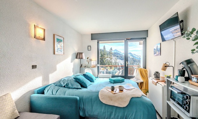 This peaceful studio offers a relaxing stay, with its small sun-drenched balcony and views of the mountains and slopes - ideal for 2 travellers or a couple with a child. The living area has a double sofa bed and a seat that folds out into a single bed, plus a small fully-equipped kitchenette. You'll enjoy the convenience of walking to the Manigod and La Clusaz ski areas. These are both very family-friendly resorts for the enjoyment of young and old alike (ESF lessons from age 2,5). Summer walks at the foot of the Plateau de Beauregard (classified Isola 2000).