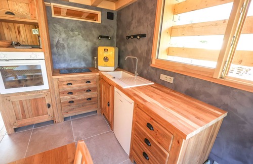 On the ground floor are the bedroom with double bed, the bathroom (with walk-in shower) and the staircase leading to the kitchen/living room area. A "hut-refuge" style mezzanine houses 2 additional beds.