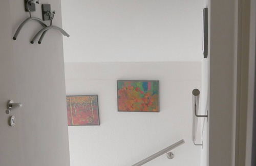 The apartment is located in a quiet cul de sac near the forest. It has a separate entrance, through which the apartment is reached via a staircase on the first floor above a garage. The garage is not used for vehicles.