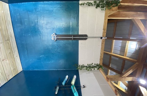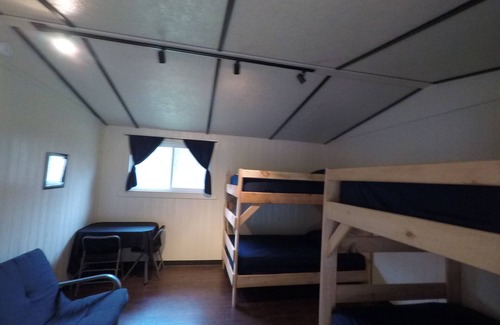 The suite has 2 full-sized bunk beds (4 beds total), vaulted ceiling, sitting area with futon couch and small table and chairs, hammocks on front deck. Linens, towels and shower supplies included.