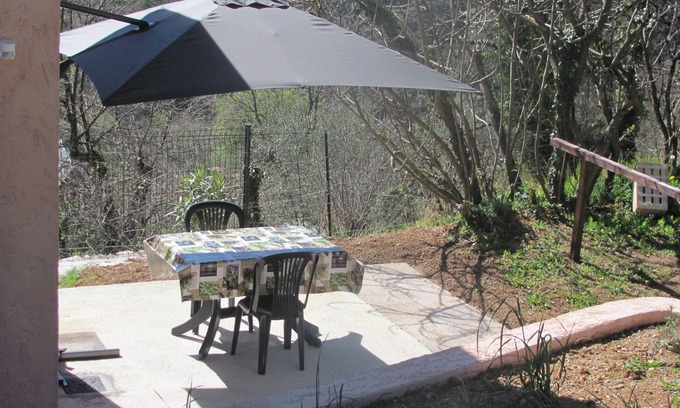 small house completely renovated, local plastered exterior, modern and functional interior in the countryside of the Nice hinterland 3 km from Roquebillière, Vesubie valley, near the Mercantour massif. organic swimming pool. Sea at 60 km. French-made bed and sofa bed.