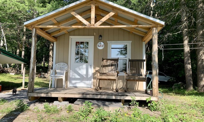 Nestled in the woods on the shores of Black Lake this small waterfront cottage is peaceful and private, offering a large screened porch to sit and watch the sunsets! It has two bedrooms and one bath in the main cottage (530 sq ft) and a separate bunk house (100 sq ft) that allows for sleeping accommodation for 7 additional guests. Kitchen and living area is open plan with a large enclosed back porch that makes a great entertaining space. Two firepits. Dock. BBQ. Peddle boat. Canoe. Lawn games. Camping atmosphere in rear of house and lake vibes in front of house. Fully stocked kitchen. Linens, towels, toiletries all provided. Washer & Dryer. Clothesline. There is access to a private boat ramp 1/4 mile away. We use this place when it isn’t rented so we have everything needed to have a relaxing lake visit. We are always improving and adding value for our guests and ourselves. **Please note that Black Lake is not ideal for swimming due to lake weeds & lake muck.** Also - This is a cottage/camp in a woodsy area on a lake. There is lots of nature around! Fish to catch, birds to watch, mosquitoes to smush… we treat for insects, pests, and critters but we do not have the ability to control Mother Nature. There will be some gnats, mosquitoes, spiders and flies around the outside of the property due to the wooded lake location. We provide mosquito repellant and bug spray. The house itself has room to sleep 6 (1 queen bed, 1 full bed, 1 queen futon) and the bunkhouse has 7 twin beds. There is a step down to access the living room, one bedroom and the porch. There is one step up to the bunkhouse. There is also an unpaved incline to reach the dock/lake. Verizon cell service works great, but there is no service with other cell providers.