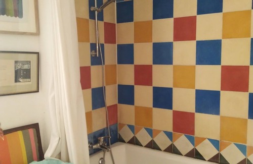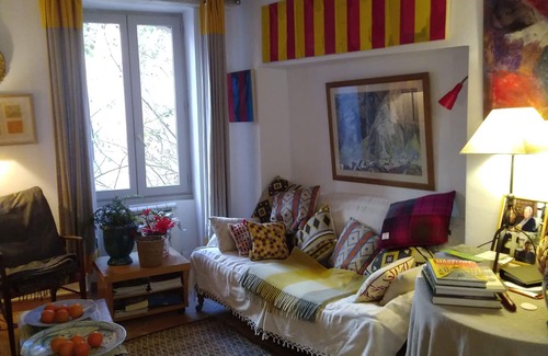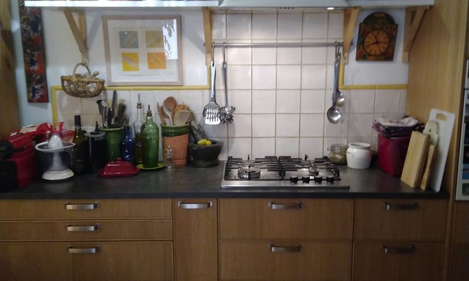 The house is a family home on 2 floors with original artwork on the walls and a large collection of music,films and books.The walls are thick for coolness in summer.A gorgous rose Pierre de Ronsard climbs oustide. There are two floors available to let. The 1st floor (short flight of steps from entrance) is the main living area -open plan living room with beamed ceiling, with a fully equipped kitchen. TV(small flat screen) and music/DVD /CD player available.Comfortable 3 seat sofa, occassional chairs as well as large dining table and 6 dining chairs. Victorian scottish pine glass fronted dresser with glass and china.Bathroom is nearby before staircase to 2nd floor.