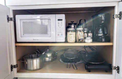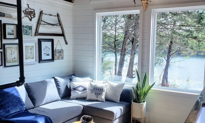 Adorable tiny home cabin in the woods with gorgeous waterfront views. Only 40 minutes to Dallas. Contains a well appointed kitchen with microwave, hot plate double burner, fridge, coffee maker and more! Book your getaway today. Built with the gorgeous naturally aged cedar from the surrounding land, this cabin is both cozy & open with a wall of windows overlooking the water. Don't miss out on this incredible experience!