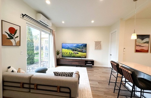 Discover the charm of our 500sqft unit a spacious retreat with 10ft ceilings and 8ft interior doors. Enjoy the cozy, roomy, and bright atmosphere of our freshly renovated unit. The bedroom comfortably sleeps 2, and the sofa doubles as a twin sleeper. Whether traveling solo or with a companion, our unit accommodates up to 3 guests. Be the first to enjoy this unique blend of small-town luxuries and style!