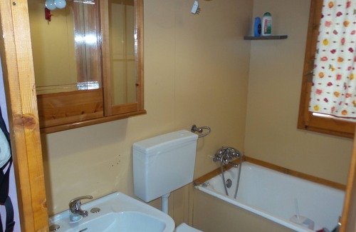 The small wooden hut is well insulated even in winter. Equipped with an old cast iron stove that heats the whole room well in no time, even in cold temperatures. Composed of living room kitchen area with table armchairs and sofa bed. Smaller bathroom with mini bath tub. Smaller bedroom with two bunk beds with bedside table and lights. A closet available.
