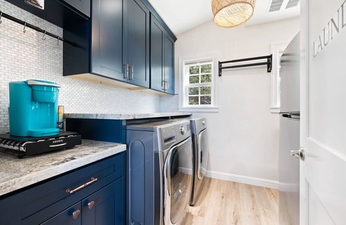 Fully equipped chef kitchen is all set up for cooking and entertaining. Two large supermarkets are 13 minutes away and a small convenience store 9 minutes from the house. We provide two refrigerators for your groceries, one in the kitchen (with two ice makers), and the other one upstairs in the laundry room.