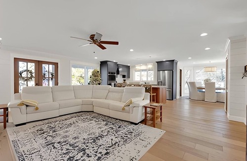 • Cozy Interior- Open concept living and dining area with large windows framing endless lake vistas.