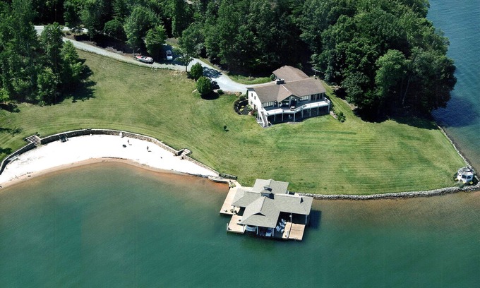 This one-of-a-kind property is the ideal setting for making memories at the lake with your family! Enjoy wide water views with privacy on 7+ acres in your own protected alcove just off the main channel. Features a HUGE covered boat dock with bar, large sandy beach with fire pit, and a gazebo on the point overlooking the lake.