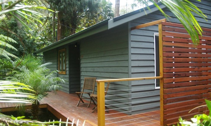 The 2 bedroom western red cedar cottage is nestled within a tropical rainforest reserve, with cabbage tree & pacific palms, towering gum trees which are home to cat birds, brush turkeys, black cockatoos, kookaburras, whip birds, bats, possums.....and lots more.The rain-forest at the rear of the house is home to a large bat colony in the warmer months. The bats fly off at dusk to feed elsewhere & most of our guests find this an amazing experience to be able to witness nature so close from the comfort of their own private tree house.